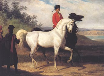 Mention must be made of the Antoniny Stud of the Potocki family, also founded in the ninenteenth century. The best known horse there was the spectacular Ibrahim, bred in the desert and bought in 1907 in Constantinople by a dealer for Count Joseph Potocki. Ibrahim died during the Bolshevik revolution in 1917 (Antoniny was at that time in land that was considered Russian), but his immortality in Arabian horse history was guarnteed by his son Skowronek, foaled in 1909 and later exported to England. Ironically, due to the turmoil of twentieth century war, the Ibrahim sire line was lost to Poland until its reintroduction with the importation of *Naborr from Russia in 1956. (*Naborr's paternal grandsire Naseem was a Skowronek son bred in England).