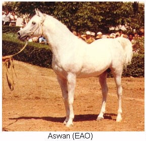 Another important influence added to Polish breeding through imports from Russia was that of Aswan, bred in Egypt and given as a gift to the Russian government. Four sons of Aswan were used at stud in Poland, including*Magnat, who came to Poland in 1968 (where he sired Derby winner Sanos) and was exported to the U.S. in 1969. The most important Aswan son used in Poland was Palas, sire of Polish National Champions as well as U.S. National Champion Mare *Penicylina and Canadian National Champion Mare *Camea. The Aswan daughter Parma, imported to Poland in 1968, has produced more Polish National Champions than any other mare.